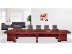 表層使用厚度為0.6mm胡桃或櫻桃木皮貼面,基材用游離甲醛含量符合E1標(biāo)準(zhǔn)中密度板,實(shí)木封邊。工藝采用德國(guó)機(jī)械熱壓工藝處理,材料覆面拼貼嚴(yán)密、平整、不會(huì)有脫膠、鼓泡、無(wú)裂紋、壓痕和劃傷現(xiàn)象;整體性能應(yīng)符合:I號(hào)限量標(biāo)準(zhǔn):GB18584-2001《室內(nèi)裝飾裝修材料 木家具中有害物質(zhì)限量》Q(chēng)B/T2384-1998《木制會(huì)議桌》
