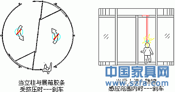 2、防夾感應膠條:安裝在展箱立柱與旋轉門出入口右側立柱上,如碰到物體或受到擠壓,門扉會馬上停止轉動,防止夾傷行人;