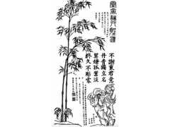 傳統武強年畫,以字蘊于竹形中,成詩文。出自三國故事,劉備被曹操所敗而關公被俘。極受優禮并封為漢壽寧侯。關公并沒動搖之意。于是畫了一張墨竹藏詩圖(詩曰:不謝東君意,丹青獨立名。莫嫌孤葉淡,終久不凋零。)于劉備以表忠義之情。“關公”即三國名將“關羽”,為國捐軀。因其忠義,后來幾代皇帝都封其為關帝圣君,被人們奉為萬能神,佛教奉其為“護法神”。
