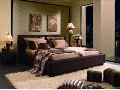 4.床品選用經典流行的深淺咖啡色合理搭配,與床屏套、床圍套色彩相互呼應,視