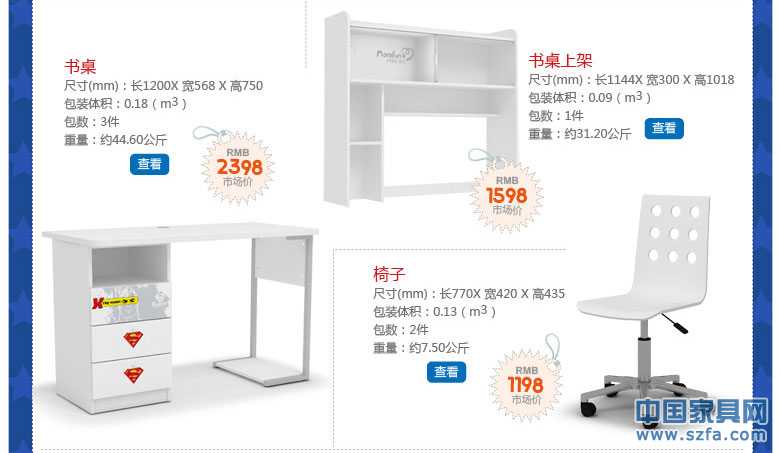 | 數套房可選單品 | 1.2米床/1.5米床+床頭柜+二門衣柜/三門衣柜+書桌+書桌上架+椅子 | 板材 | E0級環保板 | 板材厚度 | 16MM、25MM | |