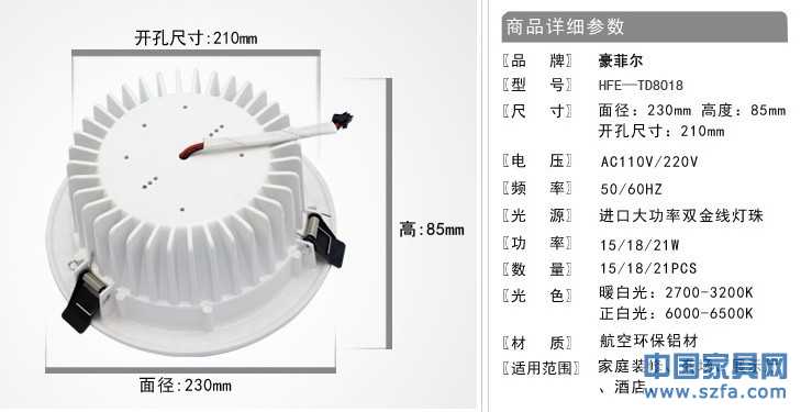 | 顯色指數(shù):>80 | LED顆數(shù):15/18/21 | 型號:HFE—TD8021 |