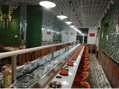 2、節(jié)省人力物力:客人在各自的座位上可隨意選擇擺放在輸送帶上的食品,無(wú)需服務(wù)員送上,本機(jī)以臺(tái)架代替餐桌,可節(jié)省大量餐桌及臺(tái)布;