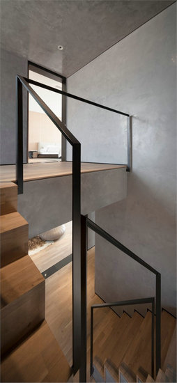 極具肌理感的灰色水泥漆結合硬朗的扶手欄桿使空間有很強的現代感,樓梯踏步的木本色又將水泥色的冷度拉回一定的平衡,空間與材料之間的銜接細節也相應體現。