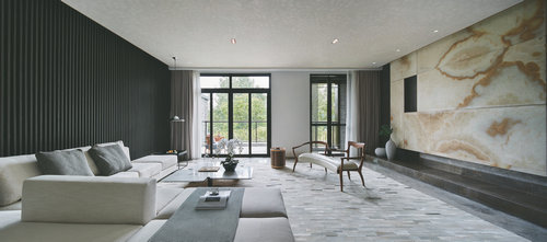 平穩式布局體現出客廳的氣勢,陽光穿透落地窗,隨意簡約,盡顯波光靈動之美。少許原木色點綴其中,簡約中富含無窮韻味,營造出低調、靜雅的氛圍。大面積百葉元素呈現一種秩序美,同時又連貫餐廳、庭院、臥室。沙發靈活多變,可滿足多元化的使用需求。入座沙發,大理石背景墻映入眼簾,其華美天然的紋理宛如一幅水墨畫。