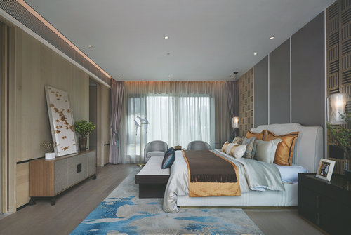 龍湖·西宸原著作為一座位于城市三環內的蜀韻府邸,特殊的文化與情懷需落實到生活中,而不僅僅停留在看上。樸悅設計不僅延續了蜀貴含蓄、高雅的生活方式與禮制之道,提煉出經典元素加以簡化和豐富,家具形態更顯簡約與流暢,空間配色以自然大地色系主導整個空間,再加以沉穩、靜逸的灰色與藍色作為點綴,營造安靜、奢華的空間感受。