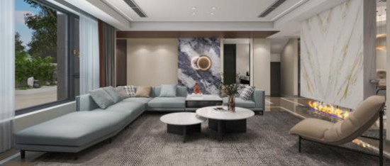 以空間尺度彰顯人生氣度,會客廳挑高設計演繹從容大氣的場域精神,大塊大理石背景墻垂直而下,水墨紋理飄逸自如,賦予空間詩意。